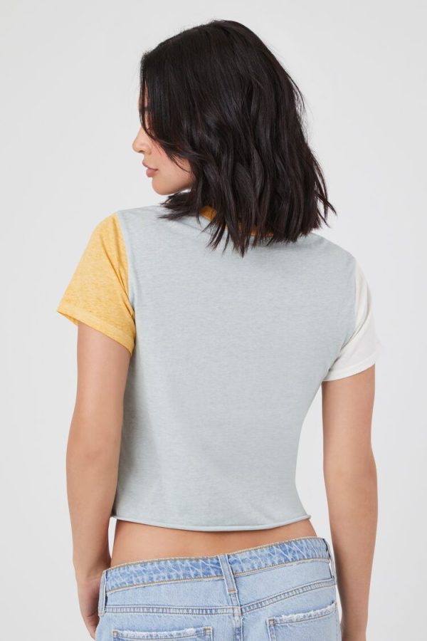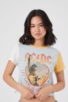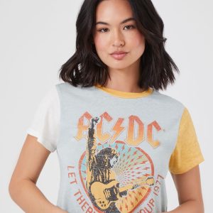 A slub knit tee featuring front ‘ACDC’ and ‘Let There Be Rock Tour 1977’ text. accompanying graphic. colorblock design. short raglan sleeves. a crew neck. and raw-cut rolled hem.