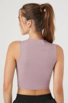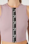 An athletic knit crop top featuring a round neckline. contrasting trim with ’21’ text. sleeveless cut. a fit that sculpts. lifts. and smooths. breathable and moisture wicking fabric. and seams that lay flat for ultimate comfort.