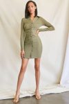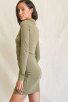 A ribbed knit shirt dress featuring a basic collar. button-down front. V-neckline. long sleeves. mini length. and a bodycon silhouette.