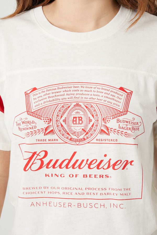 A jersey knit tee featuring a crew neck. front ‘Budweiser’ and various text. accompanying emblem graphics. contrasting trim. and short sleeves.