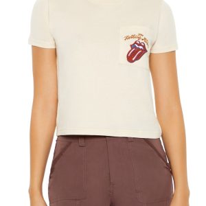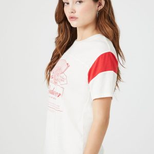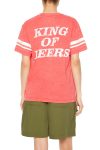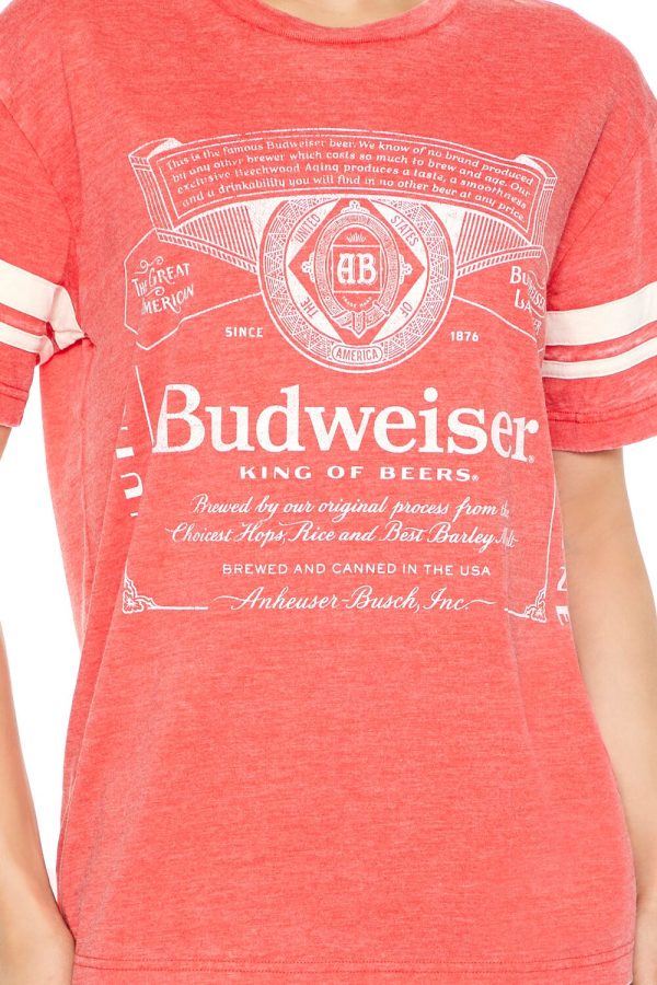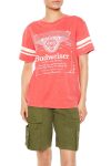 A knit tee featuring front ‘Budweiser’. ‘King Of Beers’. and various text. contrasting varsity-striped trim. an allover mineral wash. and crew neck.
