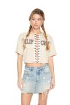 A jersey knit crop top featuring a round neckline. front ‘California’ and ‘Los Angeles’ text. front cutout with chain detailing. and short sleeves.