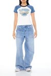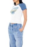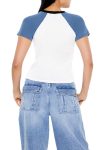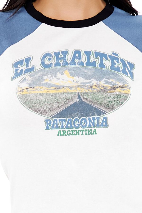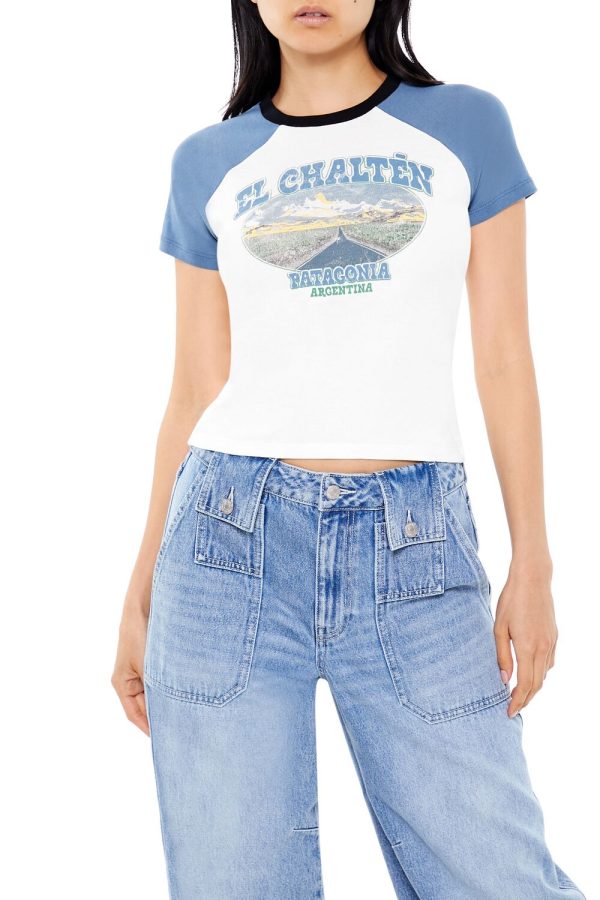 A ribbed knit baby tee featuring an allover colorblock design. contrasting round neckline. raglan short sleeves. chest ‘El Chalten’ and ‘Patagonia Argentina’ text. accompanying landscape graphic. and cropped hem.