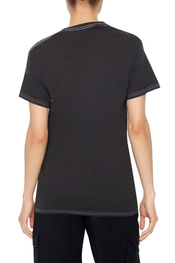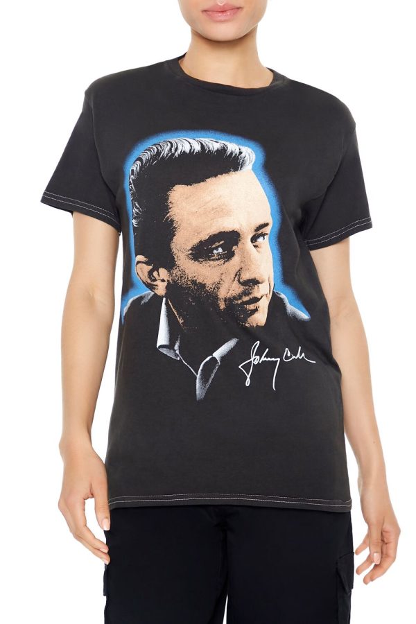 A knit tee featuring a crew neck. front ‘Johnny Cash’ text. accompanying music artist graphic. contrasting topstitching. and short sleeves.
