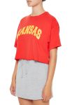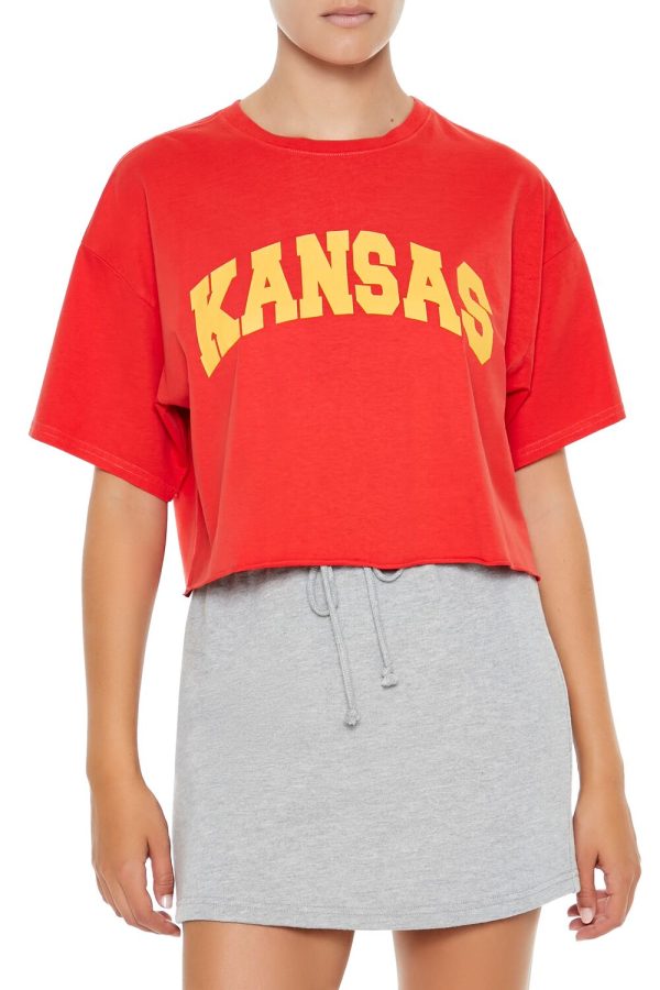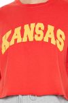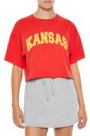 A jersey knit tee featuring a crew neck. front ‘Kansas’ text. dropped short sleeves. raw-cut cropped hem. and boxy fit.