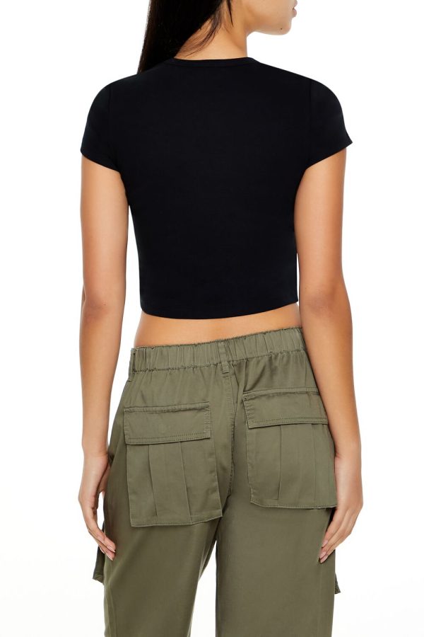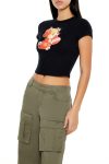 A jersey knit baby tee featuring a round neckline. front ‘Love Stinks’ text. accompanying graphic of a dog with bows. cap sleeves. and cropped hem.