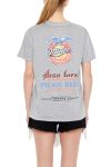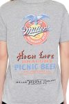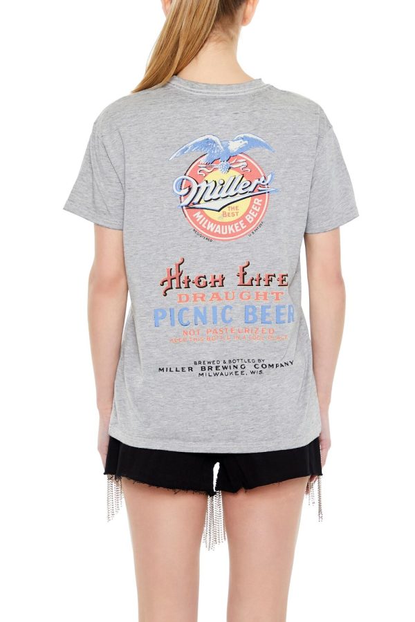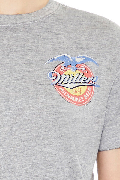 A jersey knit tee featuring a crew neck. chest and back ‘Miller The Best Milwaukee Beer’ text. accompanying eagle and emblem logo. short sleeves. and back ‘High Life Draught Picnic Beer’ and various text.