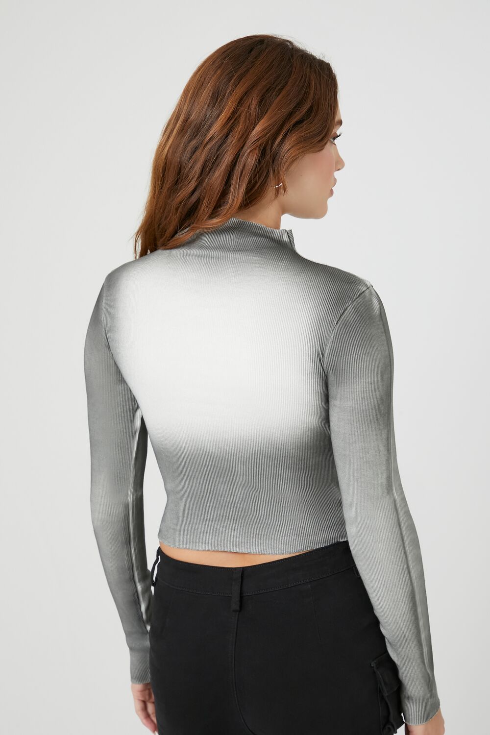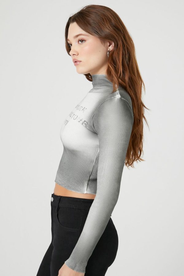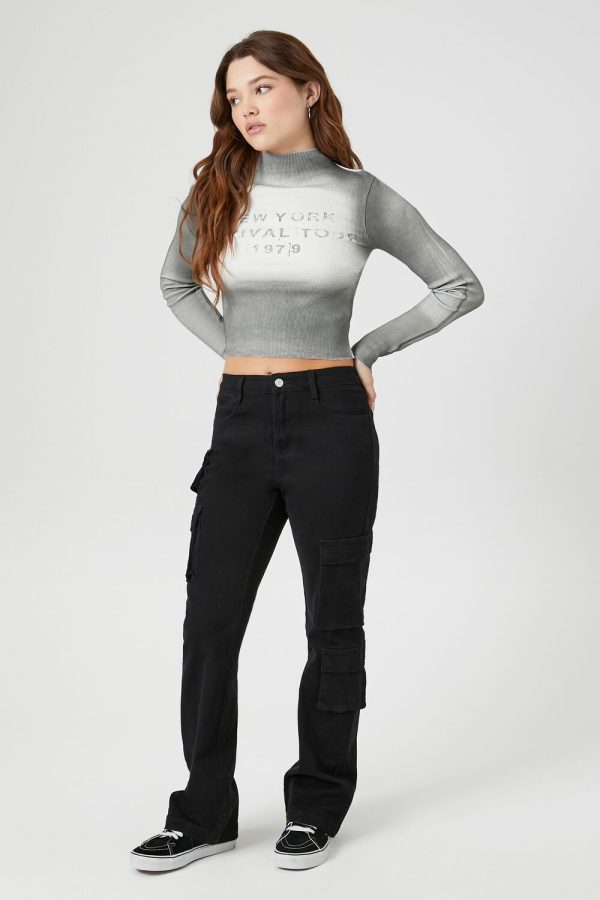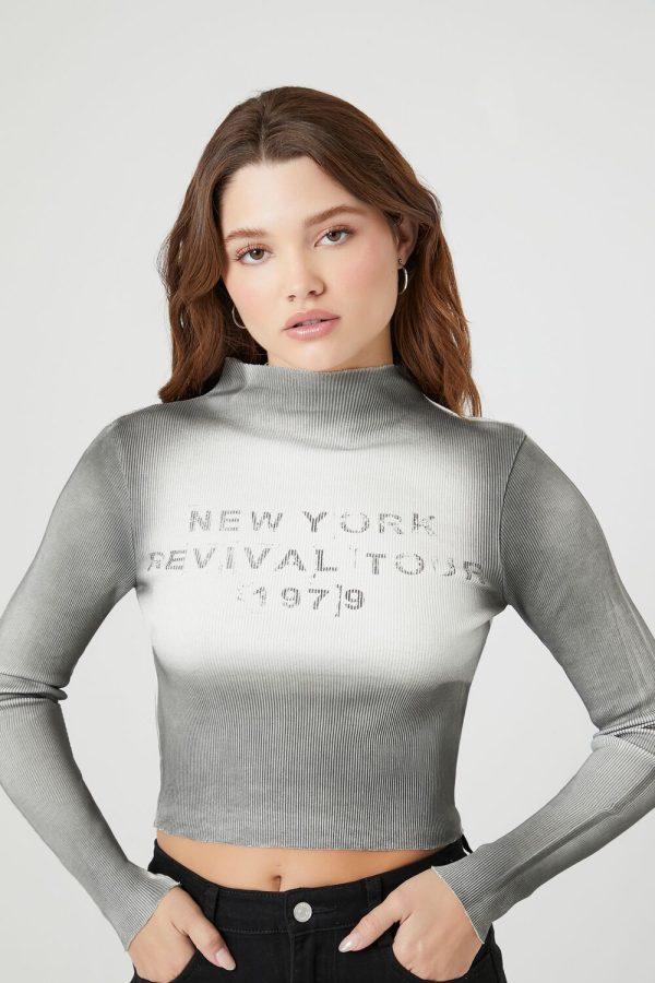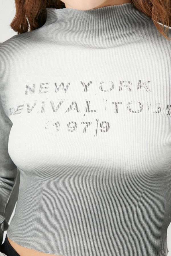 A ribbed knit top featuring an airbrush effect. long sleeves. a mock neck. front ‘New York Revival Tour’ and ‘1979’ text. and a cropped hem.