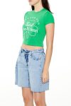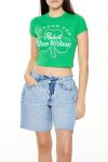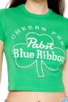 A knit baby tee featuring front ‘Cheers For Pabst Blue Ribbon’ text. shamrock graphic. short sleeves. a crew neck. and cropped hem.