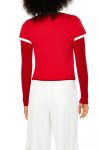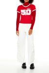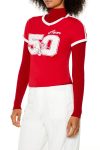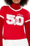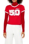 A knit tee featuring contrasting ringer trim. a V-neckline. short sleeves. front ‘Aspen’ and ’50’ text. and accompanying Snoopy graphic with beanie and ski details. (Layering garments not included.)