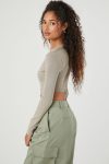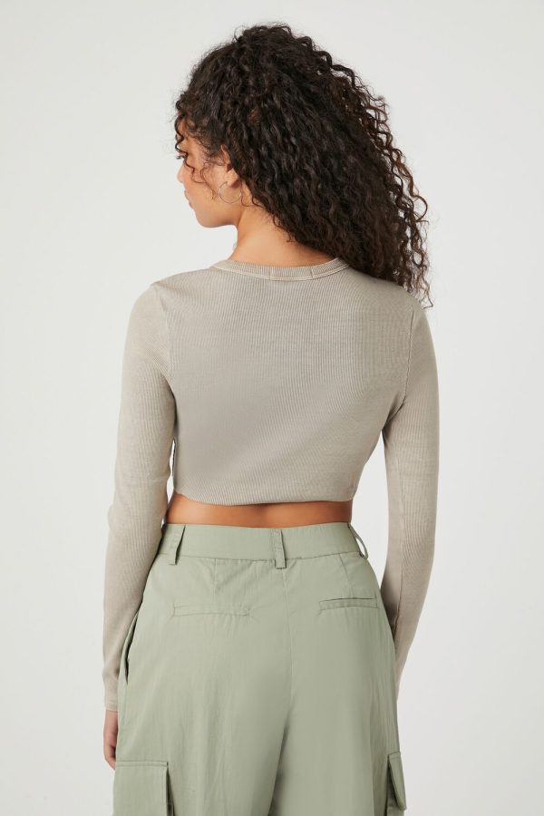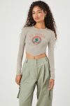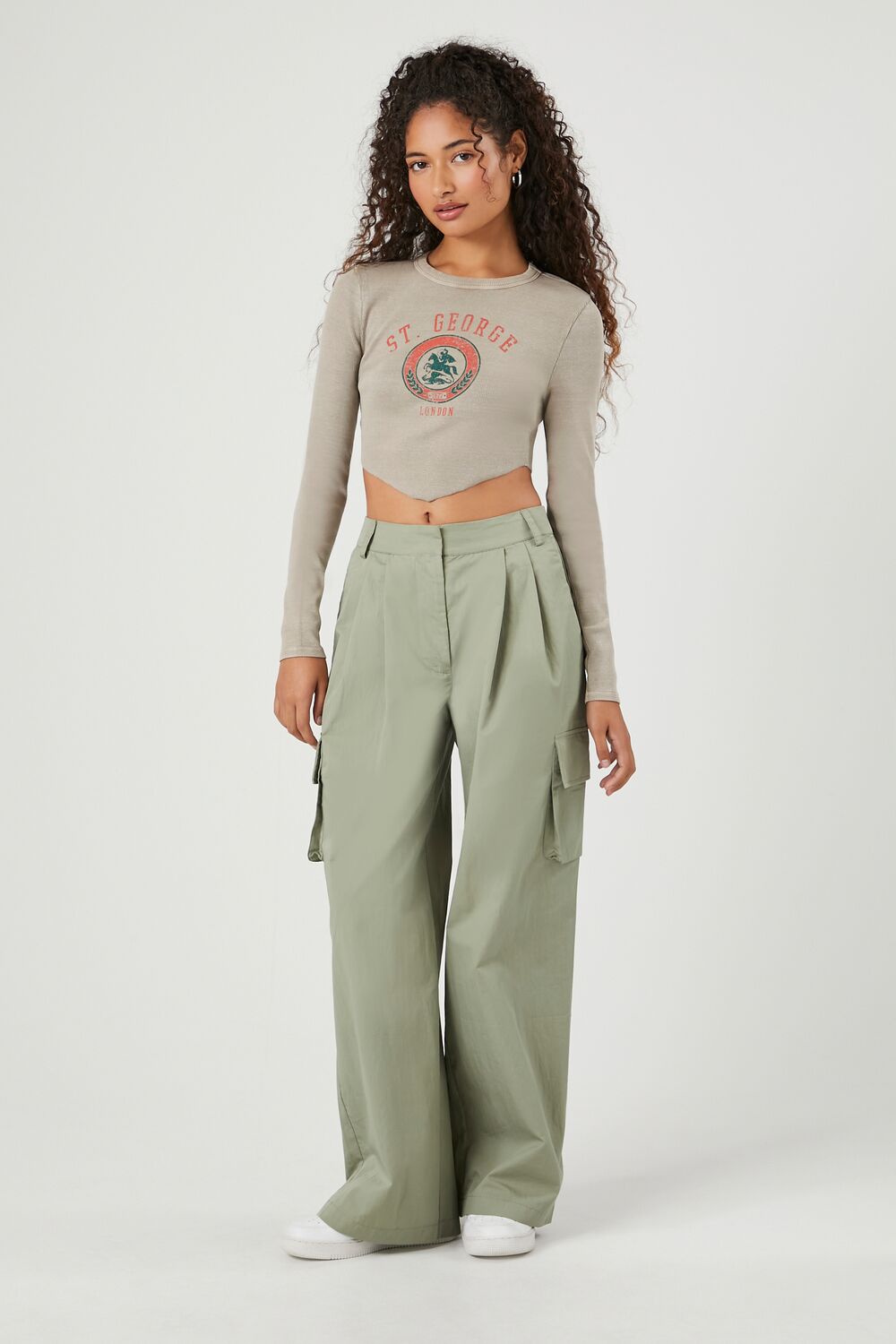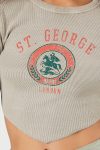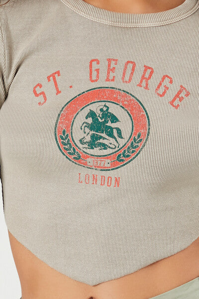 A ribbed knit tee featuring front ‘St. George’ and ‘London’ text. emblem graphic. long sleeves. a crew neck. and cropped V-hem.