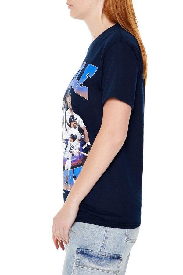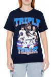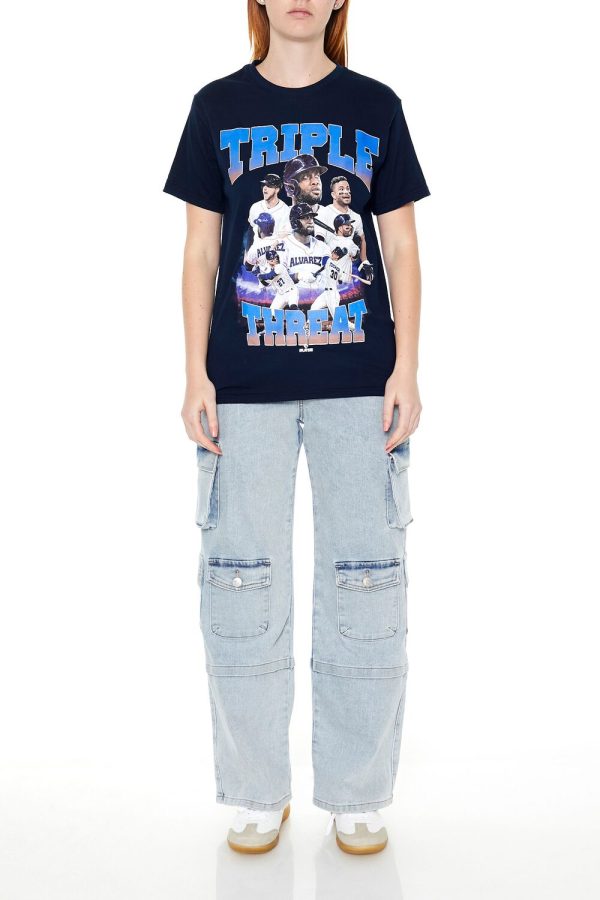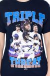 A knit tee featuring a crew neck. front ‘Triple Threat’ and ‘MLB Players’ text. accompanying Major League Baseball player graphics. and short sleeves.