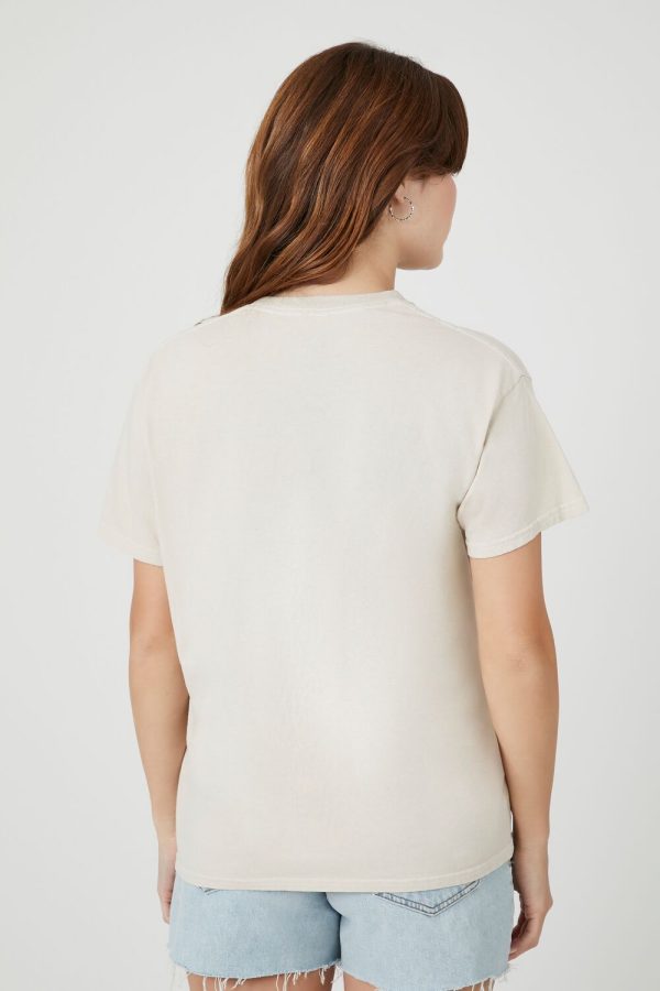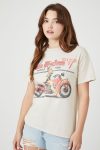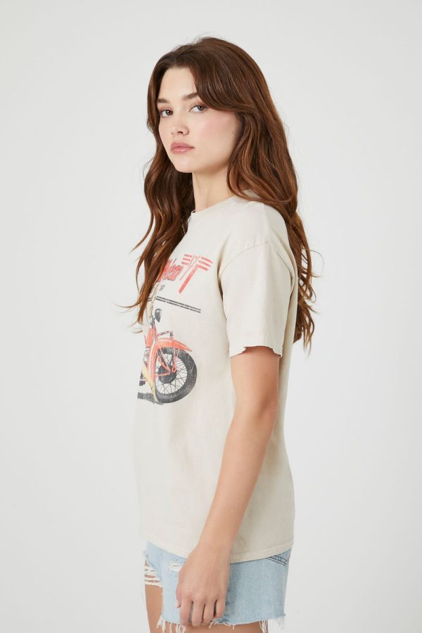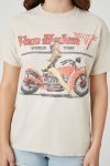 A jersey knit tee featuring a crew neck. front ‘Van Halen’ and ‘World Tour’ text. accompanying woman and motorcycle graphic. and dropped short sleeves.